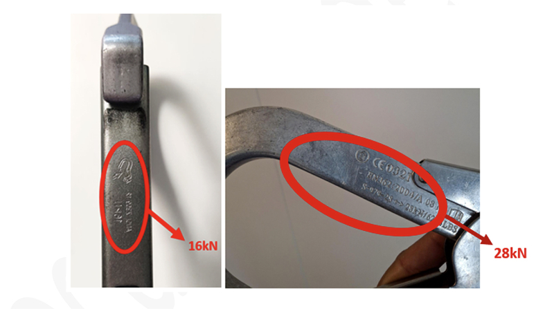 Exemple de marquage sur le fermoir. Les normes et certifications qui offrent le plus de fiabilité sur le fermoir sont la norme américaine ANSI/ASSP Z359.12 et la norme canadienne CSA-Z259.15. En ce sens, il est fortement recommandé de privilégier les connecteurs conformes à l’ensemble des normes précitées.