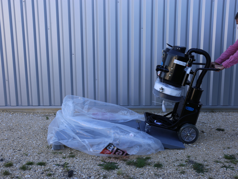 Depuis le sas de décontamination, le matériel est d’abord placé dans le sac étanche et transparent (pour bien identifier son contenu), marqué du logo règlementaire amiante. Une fois fermé de façon sécurisée, le sac est mis en dépression, puis douché. Ainsi emballé, le matériel est sorti de la zone contaminée et placé dans la caisse rigide munie de quatre roues autobloquantes. Son socle à rampe intégrée facilite le chargement en évitant toute manipulation directe et en réduisant les risques de TMS. Le transport du chantier à l’entrepôt et le stockage s’effectuent dans un volume circonscrit, sans risque de dispersion accidentelles de fibres nocives.