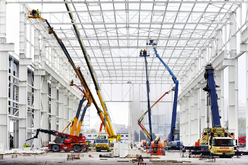 Caractérisé par sa grande envergure, le chantier l’est aussi par la présence de nombreux corps d’état et de multiples engins (nacelles, grues mobiles et chariots élévateurs, engins de terrassement, pelles et tombereaux). Cette particularité, associée à l’évolution rapide de la configuration du chantier, nécessite une bonne planification et une grande vigilance sur les flux d’engins, la disposition des stockages et le balisage.