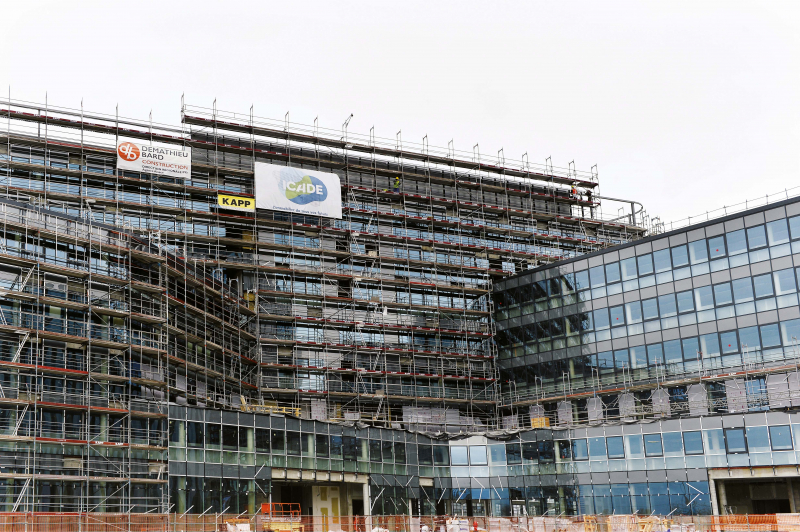 Cette organisation réduit aussi la coactivité dans la phase de second œuvre, commencée en début d’année avec une quarantaine d’entreprises sous-traitantes investissant le chantier. La réalisation de la façade en murs-rideaux, soient 7 500 m² de panneaux vitrés, répond par exemple à un phasage millimétré. Elle met en œuvre un dispositif d’approvisionnement complet, depuis la zone de livraison jusqu’à la pose à l’aide d’un équipement à ventouse, en passant par un monte-charges extérieur et des transpalettes.