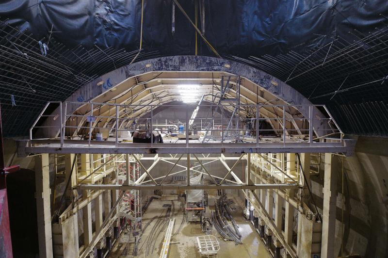 Plutôt qu’un coffrage avec panneaux bois, une structure métallique autoportante et mécanisée a été montée en fond de puits pour réaliser les voûtes de la caverne. « La problématique de grutage de pièces de plusieurs tonnes, à 80 mètres de profondeur, nous a conduits à concevoir cet outil dont l’assemblage est facilité. Il mobilise tout de même durant trois semaines des équipes spécialisées. » Utilisée seulement à cinq reprises, cette pièce majeure du chantier fait gagner en qualité, en cadence de réalisation et en confort pour les salariés.