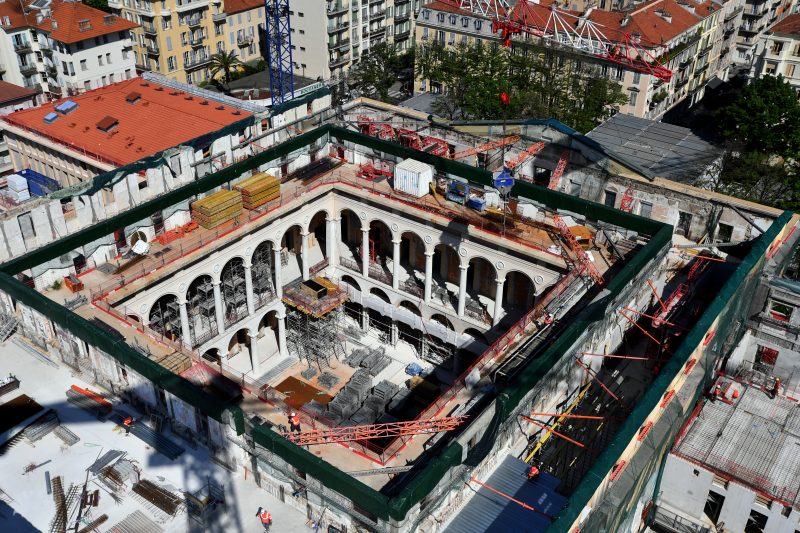 Supervisée par les architectes des bâtiments de France, la conservation des façades a fait l’objet de mesures de prévention particulières. Au fur et à mesure de la démolition des planchers, Dumez Côte d’Azur a procédé au nettoyage des façades et à leur butonnage avec projection de béton sur les parties plus abîmées. Les arches et les voûtes en RDC bas ont été renforcées et les façades emmaillotées dans des filets de façon à prévenir la chute de matériaux mais aussi à éviter la nidification d’oiseaux.