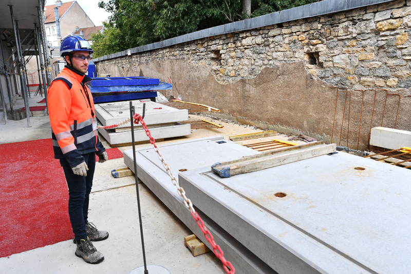 Sur ce chantier, à Belfort, des zones de stockage extérieures ont été soigneusement réparties, identifiées par matériaux et balisées pour sécuriser les circulations. Pratiques constructives sur et en dehors du chantier