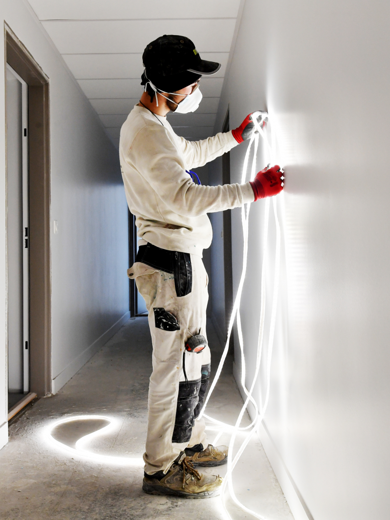 Sur les chantiers, le recours à une girafe avec aspirateur permet de poncer les murs et plafonds avec un meilleur confort.