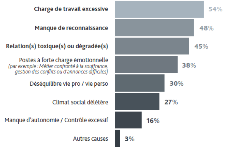 C'est une accumulation d’éléments qui mène à des RPS dans le cadre professionnel, avec trois causes citées en moyenne par les salariés, mais principalement liées à la charge de travail. 61% des employeurs déclarent avoir mis en place un plan de prévention