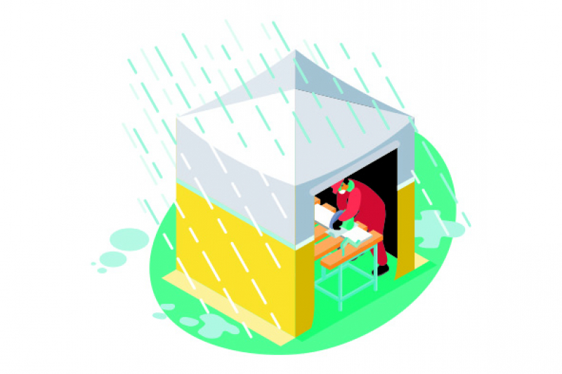 Les intempéries aggravent l’impact du froid. Lorsqu’il n’existe aucune possibilité de travailler en intérieur ou sous abri, le recours à une tente à montage rapide (ou a minima une bâche coupe-vent) s’impose. Conseil : revenir régulièrement à la base vie se réchauffer lorsqu’on exerce en extérieur.