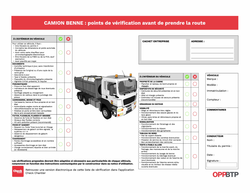 Pour rouler sereinement, voici une liste de vérifications, classées par type de poids lourd, à effectuer avant de prendre la route. Il suffit de les cocher sur une simple fiche à télécharger et à imprimer.