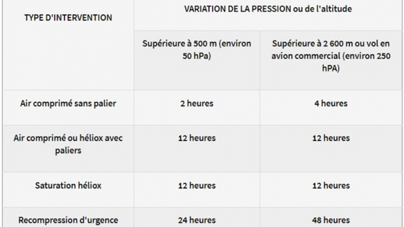 Le délai à observer, à l'issue d'une intervention hyperbare, avant d'être soumis à une pression ambiante significativement plus basse que la pression normale du lieu d'opération, notamment à l'occasion d'un voyage aérien, est donné, en fonction des différents types d'interventions et des variations possibles de la pression ou de l'altitude, par le tableau suivant :