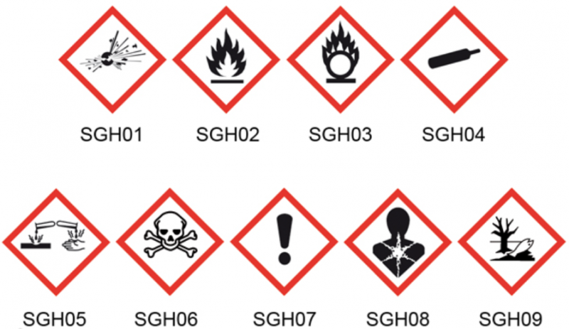 Un pictogramme de danger est une illustration graphique d’un danger particulier. (losange à bord rouge sur fond blanc, symbole noir). Par conséquent, la classification de la substance ou du mélange détermine les pictogrammes de danger devant être affichés sur l'étiquette.