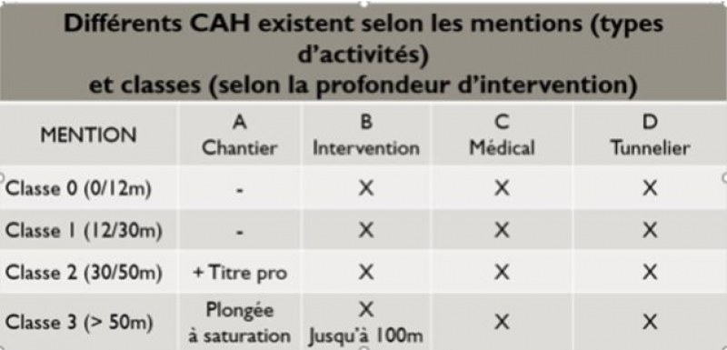 Les travailleurs hyperbares doivent posséder le Certificat d'aptitude à l'hyperbarie (CAH) de la mention et de la classe qui correspond à leur activité.
