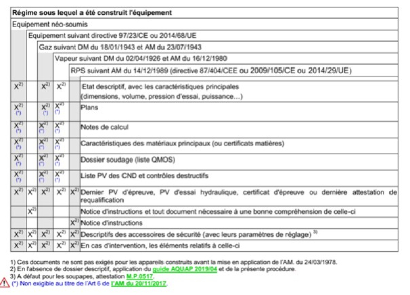 - si l'équipement a été construit selon des réglementations françaises antérieures au marquage CE ou pour les équipements néo-soumis, l'état descriptif initial ou reconstitué dans des conditions précisées par une décision du ministre chargé de la sécurité industrielle ;