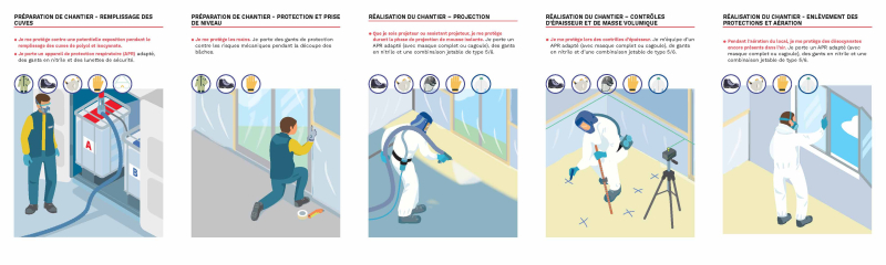 Dans toutes les activités du projeteur de mousse polyuréthane, les équipements de protection individuelle (EPI) vous protègent : les gants de protection contre les risques mécaniques protègent les mains contre les coupures, les gants de protection contre les risques chimiques, l'appareil de protection respiratoire (APR), avec masque complet ou cagoule, isolant ou filtrant (avec filtres adaptés), et la combinaison jetable de type 5/6 protègent la peau, les yeux et les voies respiratoires des aérosols émis lors des travaux. Les protecteurs individuels contre le bruit protègent également du bruit émis, notamment en phase de ponçage.