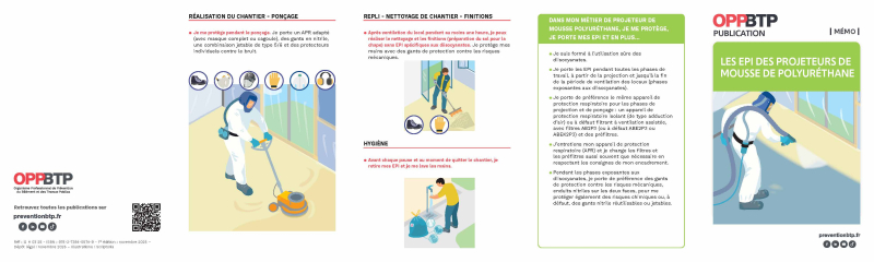 Les équipements de protection individuelle (EPI) protègent le corps lors des différentes activités des intervenants d’un chantier d’isolation par projection de mousse polyuréthane. Fournis par l'employeur, les EPI doivent être renouvelés quand ils sont usagés ou devenus inefficaces. Ces protections individuelles sont indispensables dans la plupart des situations de travail. Ce mémo décrit huit situations de travail rencontrées sur les chantiers d’isolation par projection de mousse de polyuréthane.