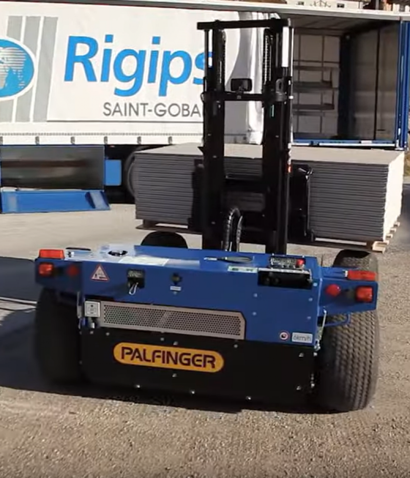 Chariot embarqué radiocommandé dans la remorque du camion de livraison, piloté par télécommande.