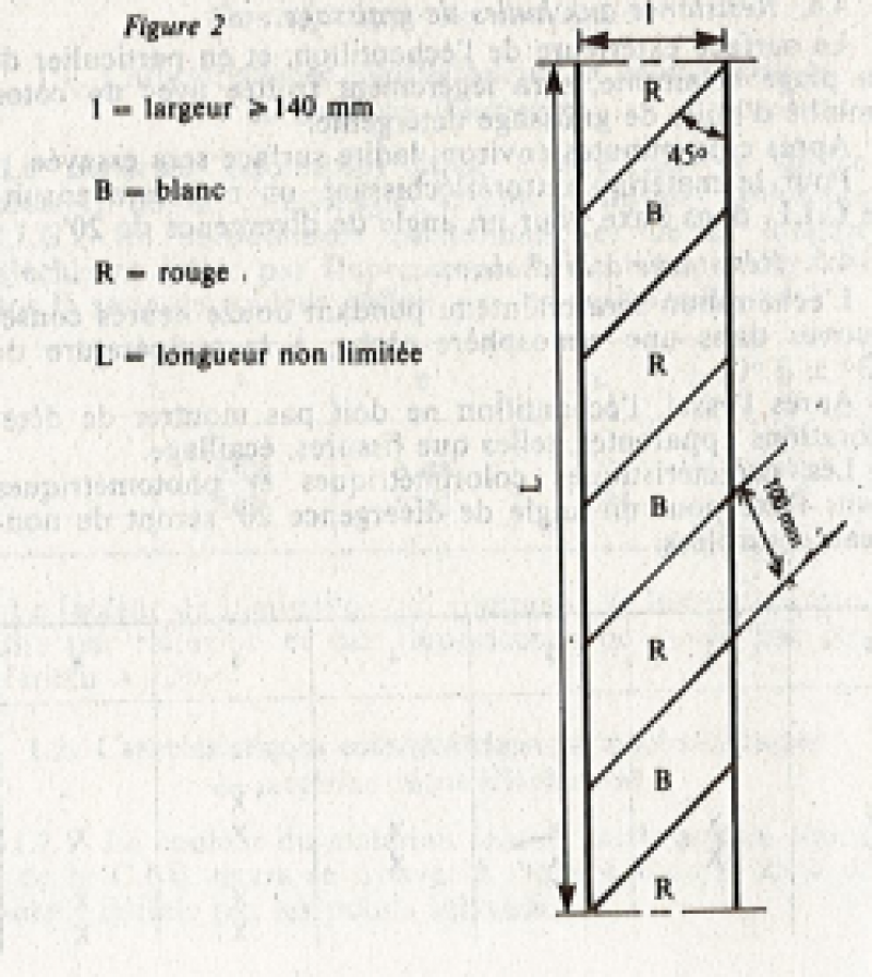 Ce dispositif de signalisation est constitué par des bandes de signalisation qui sont soit fluorescentes soit rétroréfléchissantes blanches et rouges (article 2 de l'arrêté du 20 janvier 1987)