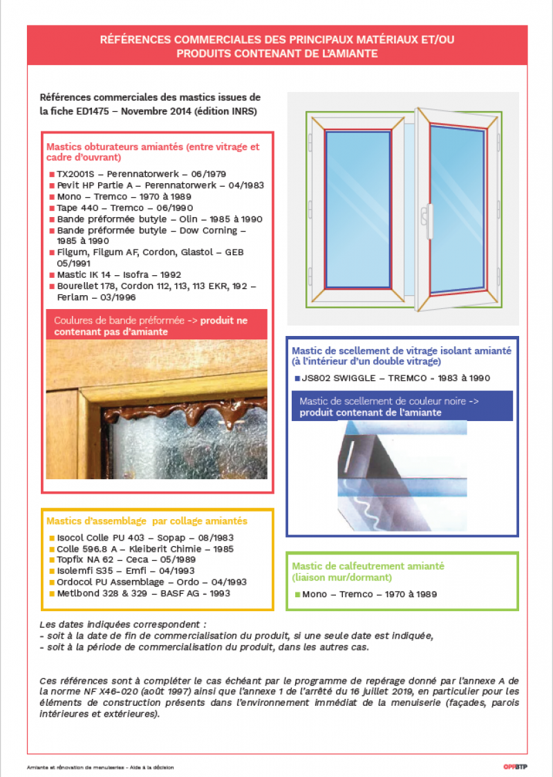 Références commerciales des mastics amiantés Cette fiche accompagne les 8 fiches pratiques portant sur les opérations de rénovation de menuiseries en présence éventuelle d'amiante. Elle indique les références commerciales (noms des produits/fabricants) des principaux matériaux et/ou produits contenant de l'amiante