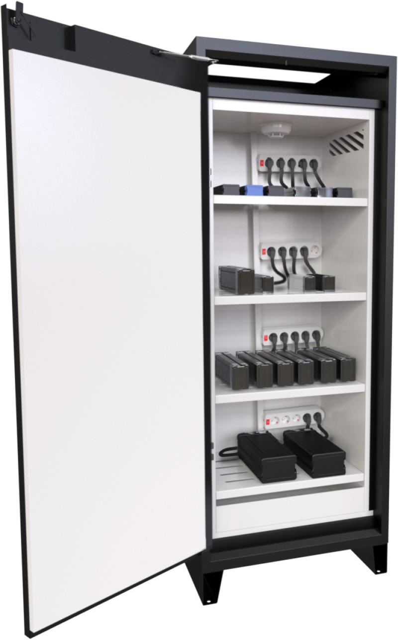 Surveillance des températures ©Vilcover - Armoire antifeu pour le stockage et la recharge en sécurité : elle permet d’isoler les batteries de l’environnement extérieur lors de la recharge et/ou du stockage. Elle se ferme automatiquement en cas de chaleur excessive, maintenant ainsi une température interne basse pour éviter les risques d’inflammation ou d’explosion. La résistance au feu est de 90 minutes.