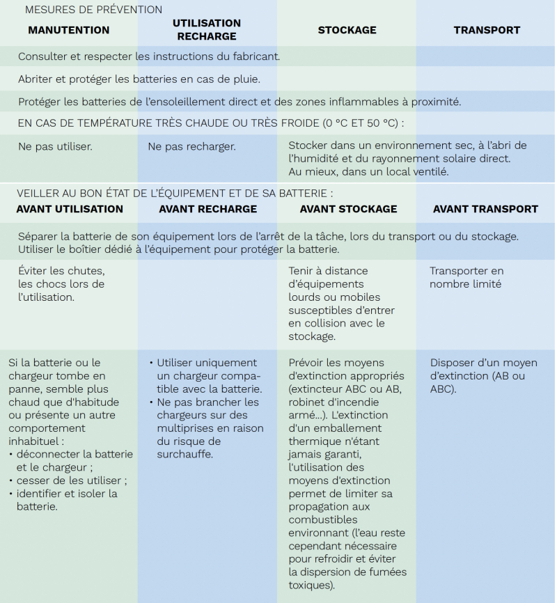 Pour supprimer ou réduire les risques liés à l’utilisation de batteries, des mesures de prévention sont à mettre en œuvre, aussi bien lors de l’utilisation du matériel fonctionnant sur batterie que lors du stockage, du transport, du rechargement de la batterie.