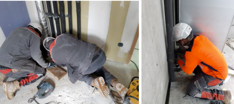 De manière générale, le rebouchage des trémies est réalisé par « campagne » (soit par niveau, soit par colonne montante) par le lot gros œuvre. Une coactivité avec d'autres entreprises intervenant sur les plateaux de travail peut donc avoir lieu et occasionner des difficultés d’accessibilité au poste de travail pour effectuer le rebouchage des trémies. Cette difficulté d'accès génère des postures contraignantes et l’utilisation d’équipements non adaptés par manque d’espace suffisant.