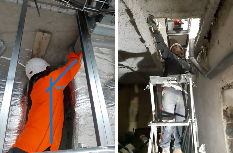 Sur l’exemple ci-dessous issu de l'étude ergonomique, nous observons que les rails réduisent l’espace de travail et ne permettent pas au compagnon d’utiliser la PIRL. Le compagnon est donc obligé d’adopter des postures contraignantes au niveau du dos (torsion de la colonne vertébrale) ou d’utiliser du matériel l’obligeant à se mettre en insécurité.