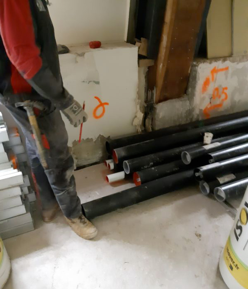 Cette étape doit permettre de limiter, voire de supprimer les risques de chute des opérateurs, en concevant plusieurs conduits de tailles réduites plutôt qu’une grande trémie. Cette conception permet également aux entreprises de disposer d’une surface de travail plus sécurisée (car intégrée à l’ouvrage) pour la pose des conduits et d’avoir des dispositifs de protections adaptés et indépendants. De plus, la création de réservations légèrement supérieures à la dimension des réseaux permet de limiter le volume de matière à mobiliser (béton, bois de coffrage, étaiement) lors du calfeutrement et de privilégier l’usage de mousses polyuréthane plutôt que du béton. - Pour assurer l’optimisation et l’harmonisation spatiale des réseaux, la maîtrise d'ouvrage (MOA) doit pouvoir nommer les entreprises suffisamment en amont pour que le maître d'œuvre (MOE) puisse coordonner la synthèse entre les différents lots techniques avant la réalisation du gros œuvre.