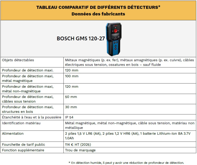 Le matériel de détection prévient également les risques associés au percement des murs, cloisons traversantes ou planchers. Voici deux exemples avec les détecteurs de deux fabricants : Bosch et Hilti.