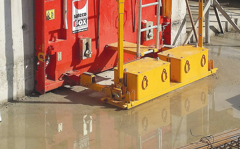 Les lests composés d’un caisson métallique en acier galvanisé ou peint, remplis de paille de fonte ou d’acier, équipant les banches dites « autostables ».