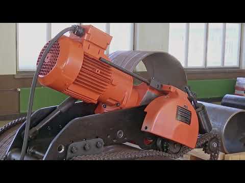 Le modèle Fein RDG 1 500 nécessite peu de place pour la rotation autour d’un tube. Les chaînes à maillons sont réglées en fonction des différents diamètres du tube. Le système de double chaîne avec têtes de serrage à ressort séparées permet des coupes sans gauchissement de tuyaux de 250 à 1 500 mm de diamètre, et jusqu’à 45 mm d’épaisseur (pour l’acier). La chaîne de guidage disponible en option maintient la scie à tronçonner pour tubes dans la trajectoire, et permet une coupe précise sans déviation, même avec des tolérances en ce qui concerne les tubes, ou les tuyaux soudés en spirale. La lame de scie peut être d’un diamètre de 160 à 220 mm maximum.