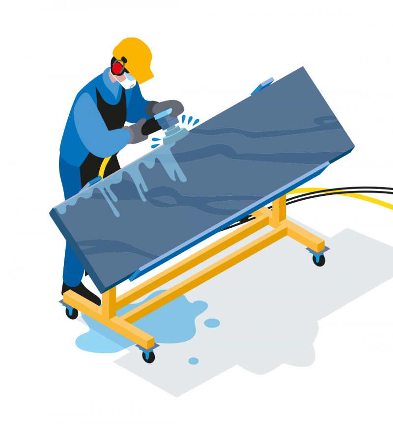 Certaines pierres, selon leur nature, peuvent contenir de la silice cristalline qui est libérée sous forme de poussières dans l’air lors des opérations de découpe ou de taille. Lorsqu’elles sont inhalées, ces poussières peuvent engendrer des maladies des voies respiratoires. Pour s’en protéger, des solutions efficaces existent. Grâce à ces techniques de travail, les émissions de poussières de silice cristalline sont réduites au niveau le plus bas possible.