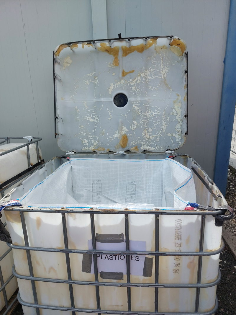 Pour répondre aux préconisations du fabricant face à ce risque, l'entreprise TSA SOGETRAS réutilise des collecteurs d'eau, récupérateurs d'eau de pluie, comme contenants pour les big-bags. Pour ce faire, l'opération consiste à découper la partie supérieure du collecteur et à mettre des charnières sur la partie arrière afin de créer un couvercle. Celui-ci est équipé d'une ceinture métallique qui permet de le renforcer. Un système de maintien est soudé sur le renfort pour tenir et manipuler le bouchon.