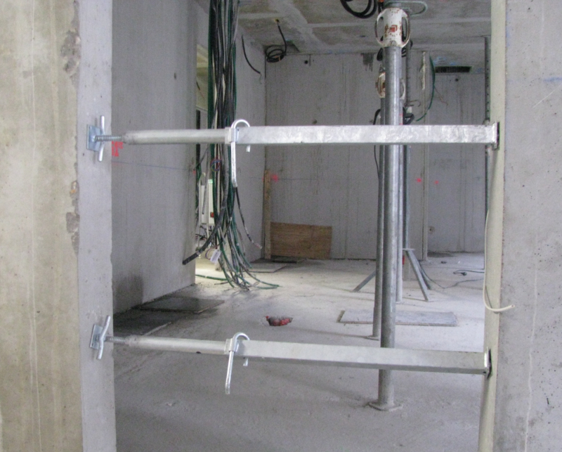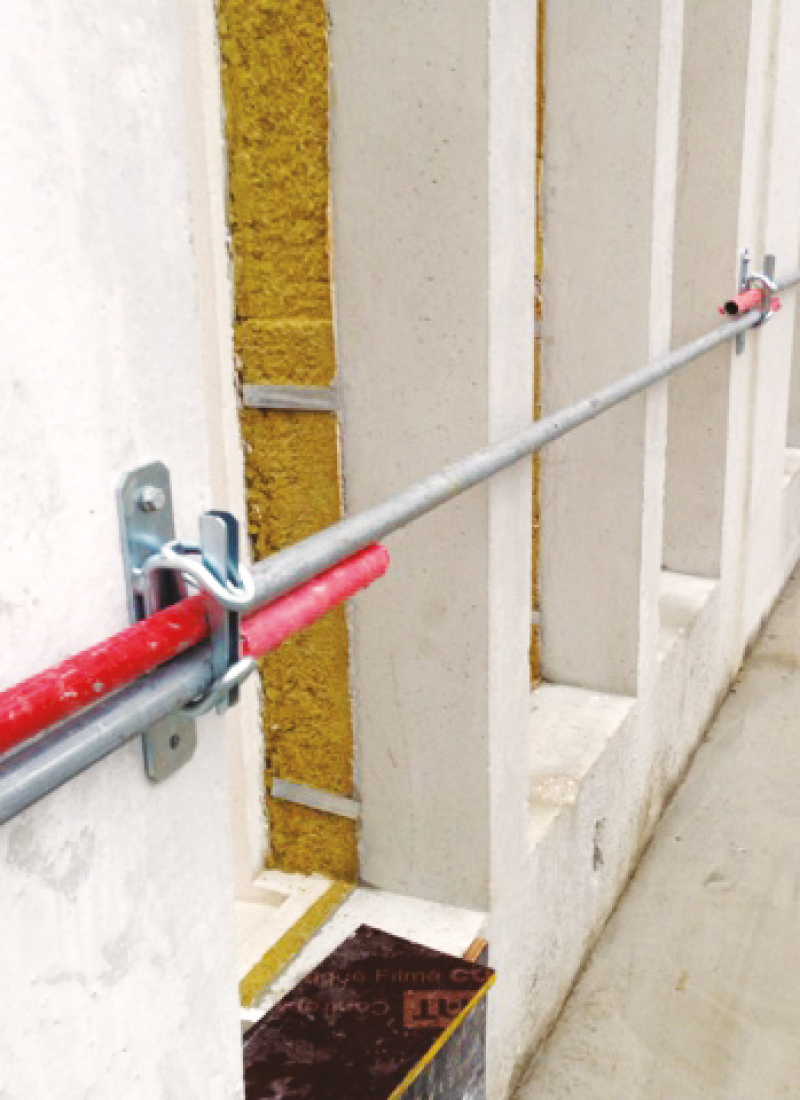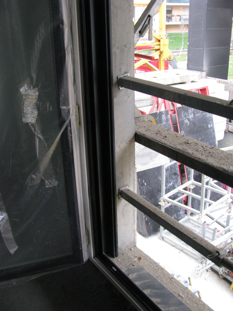 Afin d’anticiper la pose des ouvrages définitifs (fenêtres…) et de permettre le maintien des protections temporaires durant ces travaux, il peut être intéressant de positionner les garde-corps temporaires en décalage des fixations des ouvrages définitifs (en tableau pour des éléments fixés par l’intérieur ou à l’extérieur de la baie, par exemple). La mise en place des garde-corps nécessite dans ce cas une organisation en amont du chantier, dès la phase de conception avec la coordination SPS et la maîtrise d’œuvre.