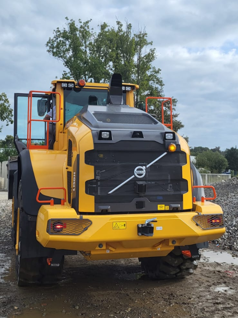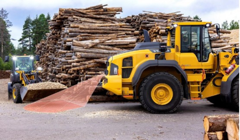Sous le logo de la marque Volvo, le dispositif de détection à l’arrière de la chargeuse