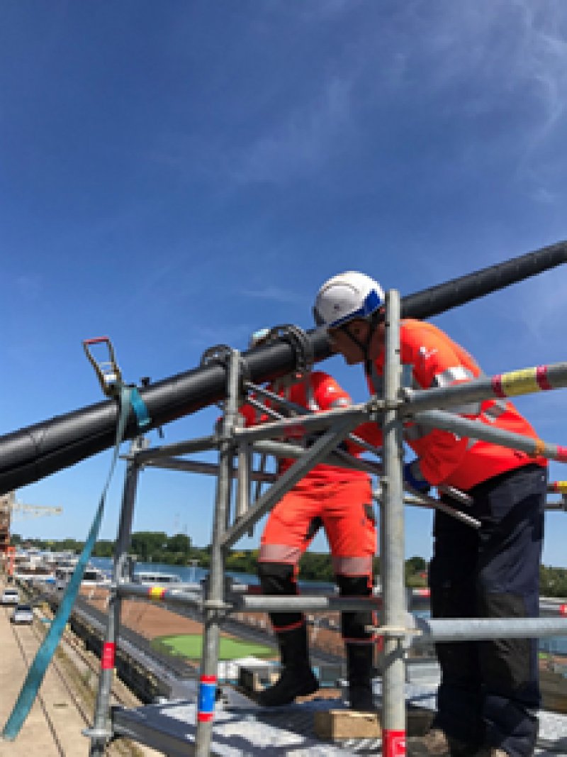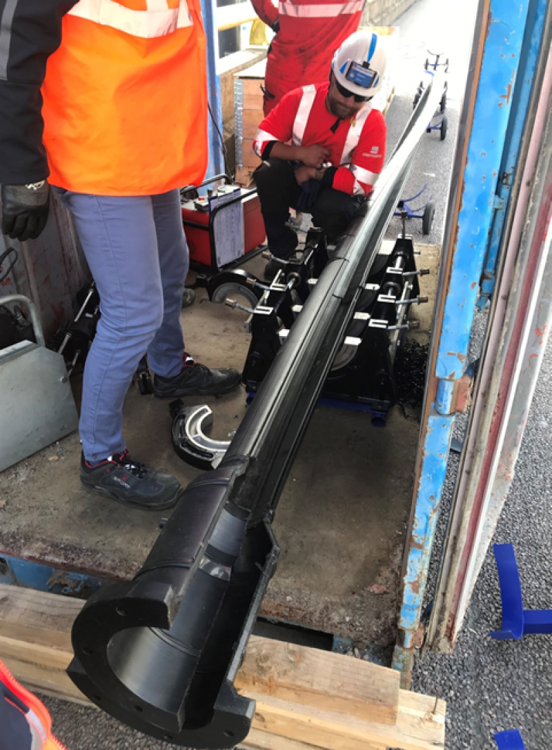 Photo 27 : Soudure de demi-coquilles en PEHD pour obtenir la longueur totale du hauban. Les demi-coquilles sont ensuite clipsées entre elles, une fois placées autour du hauban, pour former un gainage étanche. Pont de Bourgogne à Chalon-sur-Saône (entreprise Freyssinet).