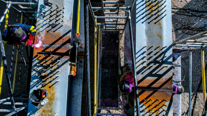 Photo 7 : Assemblage de la charpente neuve sur l'ancien tablier (on peut voir les tentes de soudage). Les travaux sont réalisés par demi tablier pour ne pas interrompre la circulation (Chantier du pont sur l'Yonne avec les Entreprises Vinci Construction France TP Lyon /Berthold). Sur les ponts les plus récents en acier (charpente PRS par exemple), l'assemblage se fait par soudure. On pratique également la démolition par oxycoupage sur tous types de ponts. Généralement, la soudure s’effectue à l’abri des intempéries à l’intérieur de tentes de soudeurs.