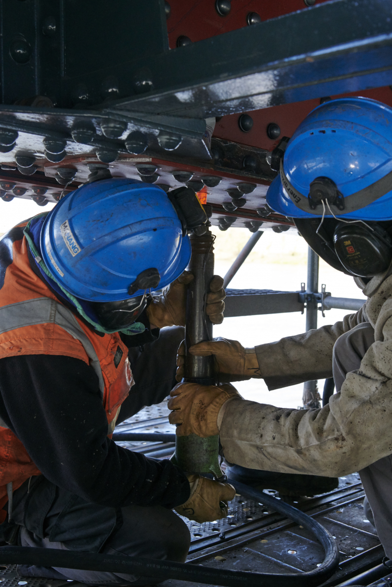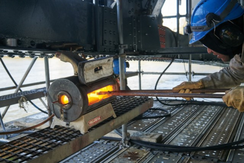 Photo 9 : La protection oculaire contre les UV , la protection respiratoire contre les vapeurs ainsi que les gants et vêtements de cuir contre les brûlures sont nécessaires. Sur le chantier du pont de ferroviaire de Pirmil à Nantes, le renforcement de la structure nécessite la mise en place de rivets à chaud. Ceux-ci sont chauffés dans un four à proximité du lieu de pose.