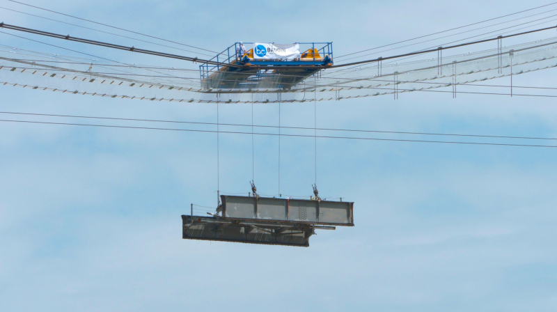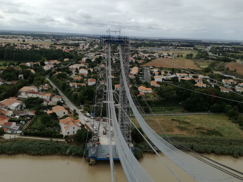 Sur le chantier du pont transbordeur du Martrou à Rochefort, la dépose du tablier a modifié complètement l’équilibre de la structure pendant le chantier ce qui conduit au rajout de câbles provisoires. Leur tension est contrôlée avec précision par des vérins hydrauliques. Des passerelles type pont de singe permettent de traverser la Charente pour passer d’un pylône à l’autre, mais également d'accéder aux postes de travail au-dessus du fleuve.