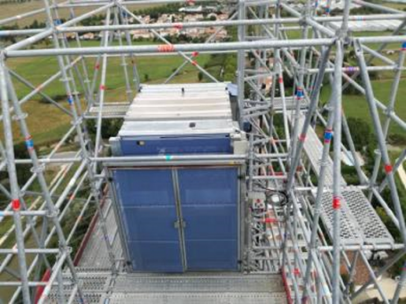 Photo 20 : Un ascenseur supporté par l'échafaudage construit le long des pylônes assure un accès rapide et confortable à la plateforme de tête. Pont du Martrou à Rochefort (Entreprise Baudin Châteauneuf). Travaux sur les haubans ou les câbles de suspension