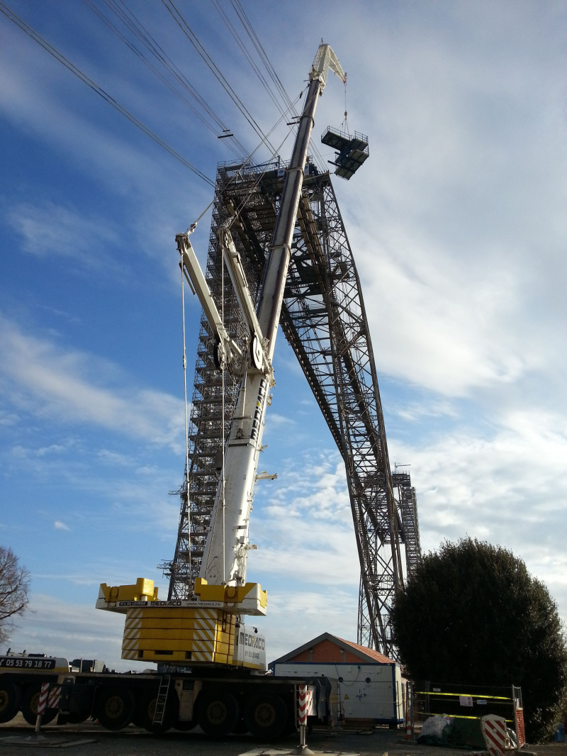 Sur le chantier du pont transbordeur du Martrou à Rochefort, un échafaudage a été construit contre les pylônes Il donne l’accès et sert également de support à un ascenseur. Des plateformes ont été placées en tête des pylônes à l’aide d’une grue mobile de 350 tonnes. Une passerelle type pont de singe permet de passer rapidement d’un pylône à l’autre.