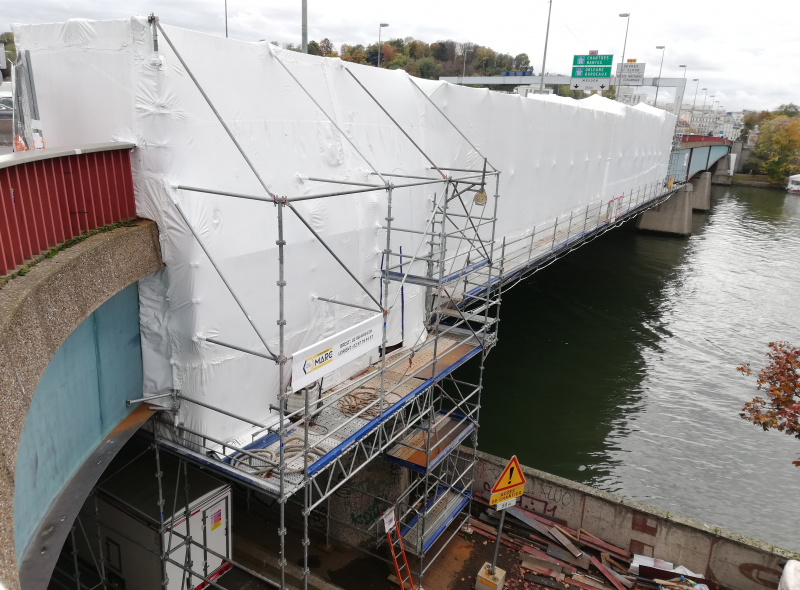 Photo 34 : Un échafaudage posé sur les trottoirs du tablier a permis la mise en place du confinement sans interrompre la circulation routière. Pont de Sèvres à Boulogne-Billancourt (Entreprise Lassarat) Mise en dépression de l'enceinte confinée