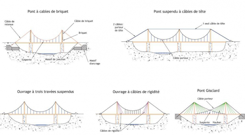 Figure 2 : Les différents types de ponts suspendus : massif d'ancrage, pylônes, câble porteur, suspentes. (Source Cerema) En comparaison des ponts suspendus, les ponts à haubans permettent de faire l’économie des massifs d’ancrage sur les culées. D’autre part, chaque hauban peut être changé indépendamment des autres, ce qui simplifie considérablement l’entretien.