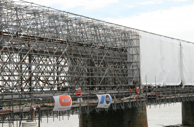 Photo 18 : On peut voir les deux échafaudages montés le long des pylônes ainsi que le pont de singe permettant de passer d'un pylône à l'autre en traversant la Charente. Pont du Martrou à Rochefort (Entreprise Baudin Châteauneuf).