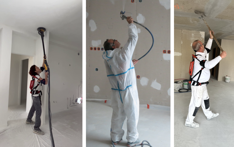 Chaque chantier nécessite généralement l’application et le ponçage d’enduit, l’application de peinture, situations de travail courantes pour les peintres, qui engendrent des sollicitations physiques liées aux gestes répétés, aux efforts et postures contraignantes « bras au-dessus des épaules » et en extension cervicale.