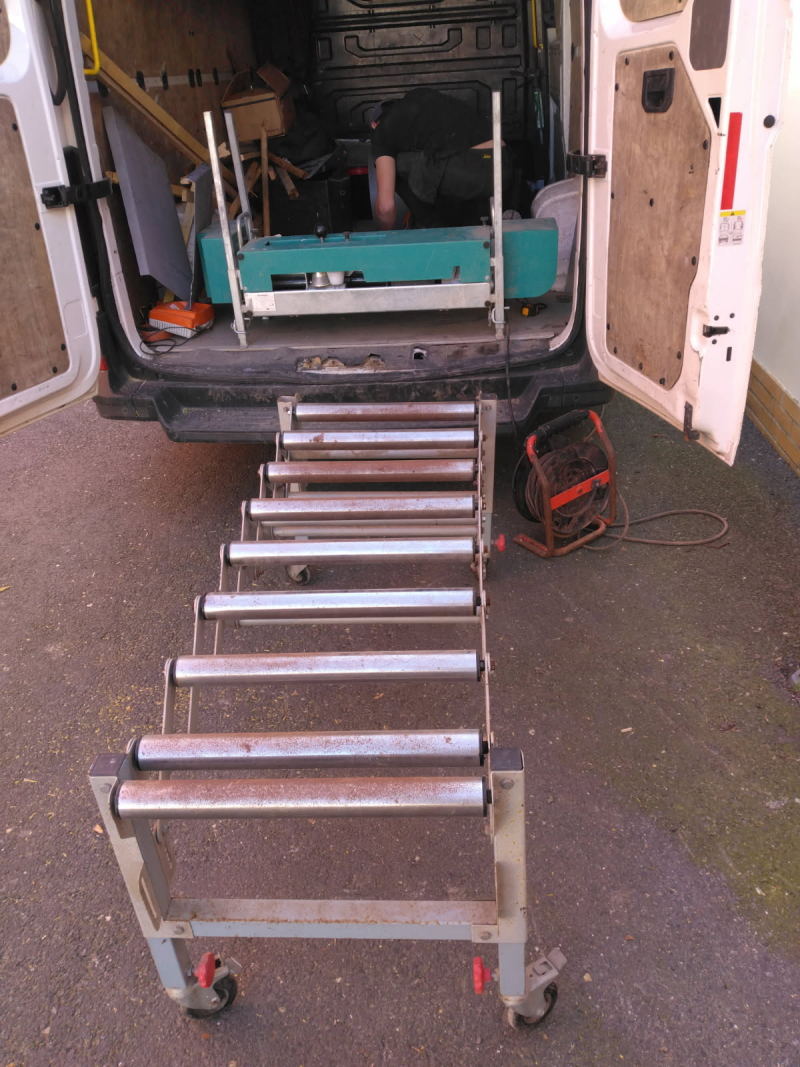 Cette table à rouleaux rétractable est facile à mettre dans le camion et à installer sur le chantier. Elle nous évite d'avoir mal au dos car on travaille à hauteur d'homme.