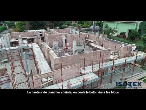 Les blocs en bois ciment sont posés à sec puis, une fois le mur en place, du béton est coulé dans les alvéoles.