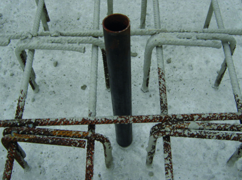 - En cas d’incorporation de fourreaux en acier ou en PVC dans le béton frais, l’entreprise doit s’assurer de la résistance du béton au moment de la pose des potelets et des lisses. En effet, un garde-corps monté sur des fourreaux noyés dans un béton de résistance insuffisante risque de ne pas résister aux efforts prévus par la norme NF EN 13374. D’une manière générale, il est conseillé d’utiliser des fourreaux en acier, en PVC ou en matériau composite, pour les planchers, et des fourreaux en acier pour les voiles ou les poutres.