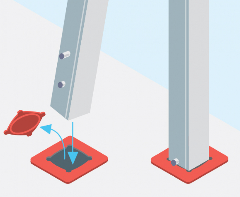 Les fourreaux doivent être en matière rigide (acier, PVC, matériau composite, etc.) et adaptés au support. Les potelets de garde-corps doivent être enfichés dans les fourreaux sur une profondeur minimale de 100 mm. Le jeu entre l’embout d’enfichage du potelet et le fourreau doit être de 2 mm maximum sur le diamètre. Il faut également s’assurer de la compatibilité des fourreaux avec les potelets (fourreaux ronds ou carrés).