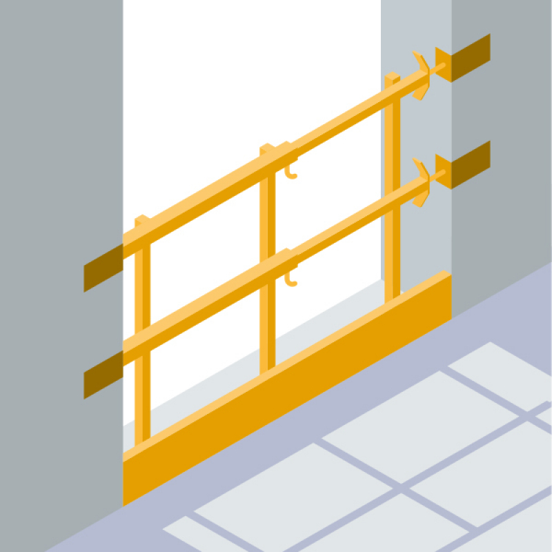 Garde-corps extensibles de baies - les protections grillagées de baies d’ascenseur ; utilisées surtout lors des travaux de maçonnerie, elles positionnent la protection à proximité de la face externe du voile. Des montants remplacent alors les potelets classiques pour adapter le niveau des lisses ou des grilles à celui de la surface de travail. Un ancrage de platines support à la dalle en béton permet de fixer ces systèmes à l’ouvrage au moyen de chevilles accompagnées de vis ou de vis à béton. Leur objectif est de prévenir la chute des compagnons travaillant en hauteur devant la baie (électriciens, finisseurs…). La partie libre doit donc être limitée à 47 cm, empêchant ainsi le passage du corps entre le linteau et la grille.