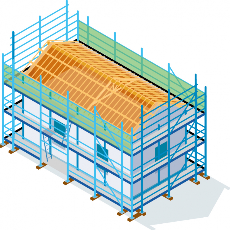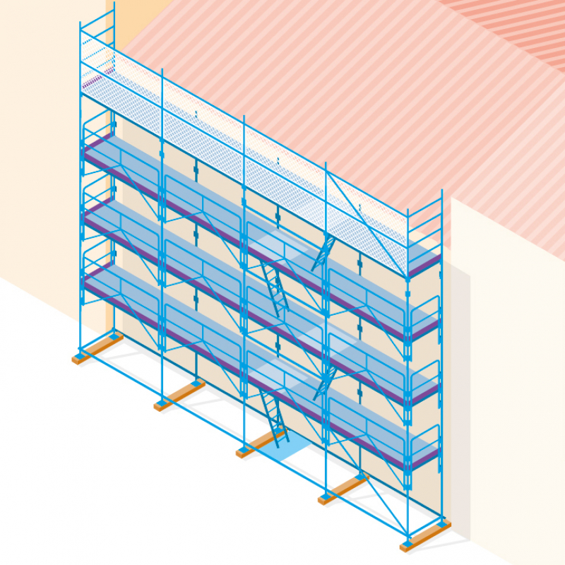 - en périphérie du bâtiment : échafaudage, permettant également un accès sécurisé à la toiture, garde-corps temporaires ;
