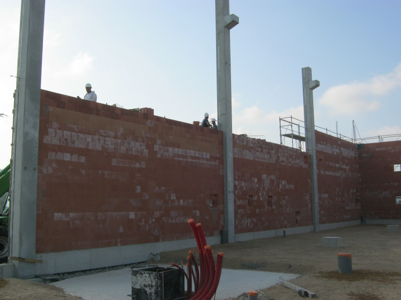 Les portiques de la charpente assurent le contreventement de la maçonnerie de façade. Le liaisonnement avec les poteaux s’exécute au fur et à mesure de l’élévation, soit en insérant la maçonnerie dans la largeur des poteaux, soit par des ancrages métalliques fixés aux poteaux et scellés dans dans les joints de chaînage verticaux de la maçonnerie.
