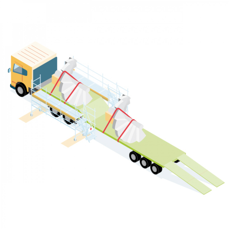 - Escaliers, gradins, cadres : les positionner couchés (leurs deux plus grandes dimensions sur le plan horizontal de la remorque).